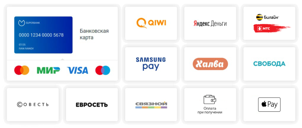 При оформлении заказа необходимо выбрать подходящую для Вас форму оплаты. Далее на странице заказа, Вы сможете произвести онлайн-оплату через выбранную систему оплаты (Яндекс кошелек, Банковские карты visa/mastercard, МИР, оплата со счета мобильного телефона и т.д.).